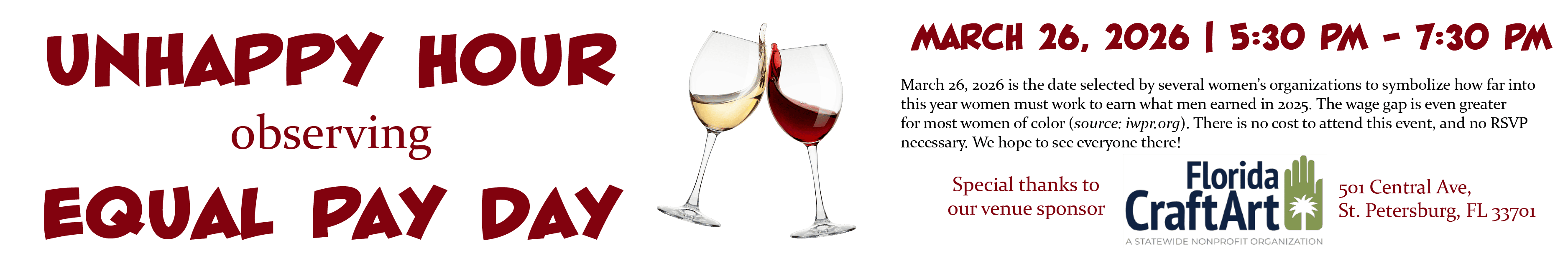 Vital to our mission for women’s workplace equity through advocacy, education and information are events enjoyed by the larger Tampa Bay Area community like our Unhappy Hour observance of Equal Pay Day in March, our Working Women’s Forum this coming April and our annual celebration of Women’s Equality Day in August.